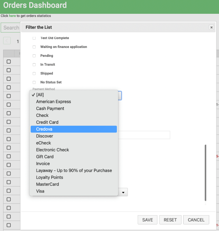 The customer will be stepped through the prequalification steps and if approved, electronically sign the contract with Credova. Orders paid with Credova can be seen in the portal, https://lending.credova.com and from within the Order Dashboard by filtering to Credova as the payment method.